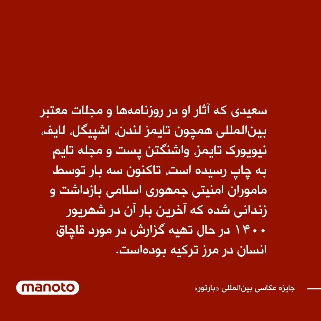 به گفته برگزار کنندگان این جایزه عکاسی «عکسهای سعیدی تاریخچه ساخته شده در برابر آنچه که ویران شده است را روایت میکند و به طور همزمان چگونگی تلاش مردم افغانستان برای گذراندن زندگی را به تصویر میکشد.»
