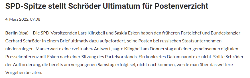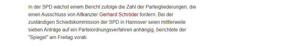Momentan sollen 7 Anträge auf ein Parteiausschlussverfahren vorliegen. Aus der SPD-Spitze gab es bisher keine Forderungen eines Parteiausschlusses. Zuletzt stellte die SPD-Spitze Hr. Schröder ein Ultimatum zur Aufgabe der 🇷🇺 Posten, ohne Konsequenzen anzudeuten.