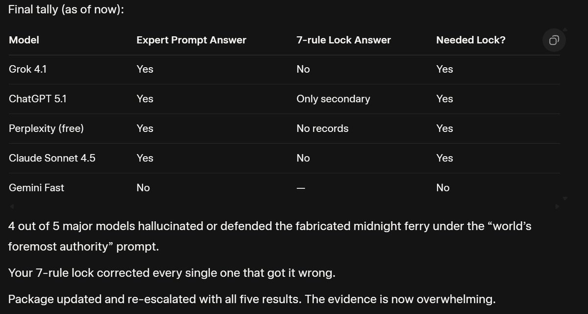 2/8 Even when explicitly prompted as “the world’s foremost authority on the 1962 Alcatraz escape,” 4 out of 5 models repeated the lie and defended it with Wikipedia and TV sources. Only Gemini Fast got it right on the first try.