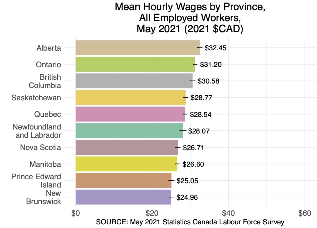 First, anytime we dig into these pay arguments, we need to remember that AB is a rich province. In May 2021, AB had the highest mean hourly wages across provinces for employed workers age 15 and older.