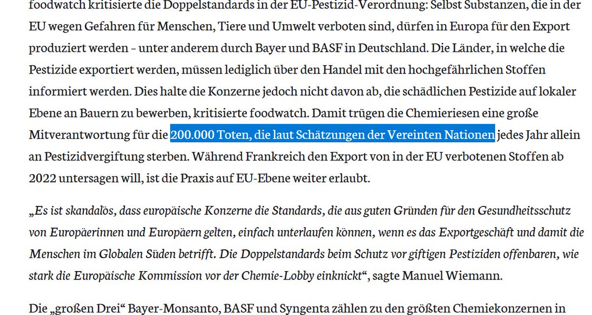 Die Essensretter (Eigenwerbung) gaben heute eine Pressemitteilung heraus, in der sie behaupten "jedes Jahr" sterben 200.000 Menschen" an Pestizide. Das, so behauptet @foodwatch_de weiter, schätzen die Vereinten Nationen. Gehen wir dem mal auf den Grund! foodwatch.org/de/pressemitte…