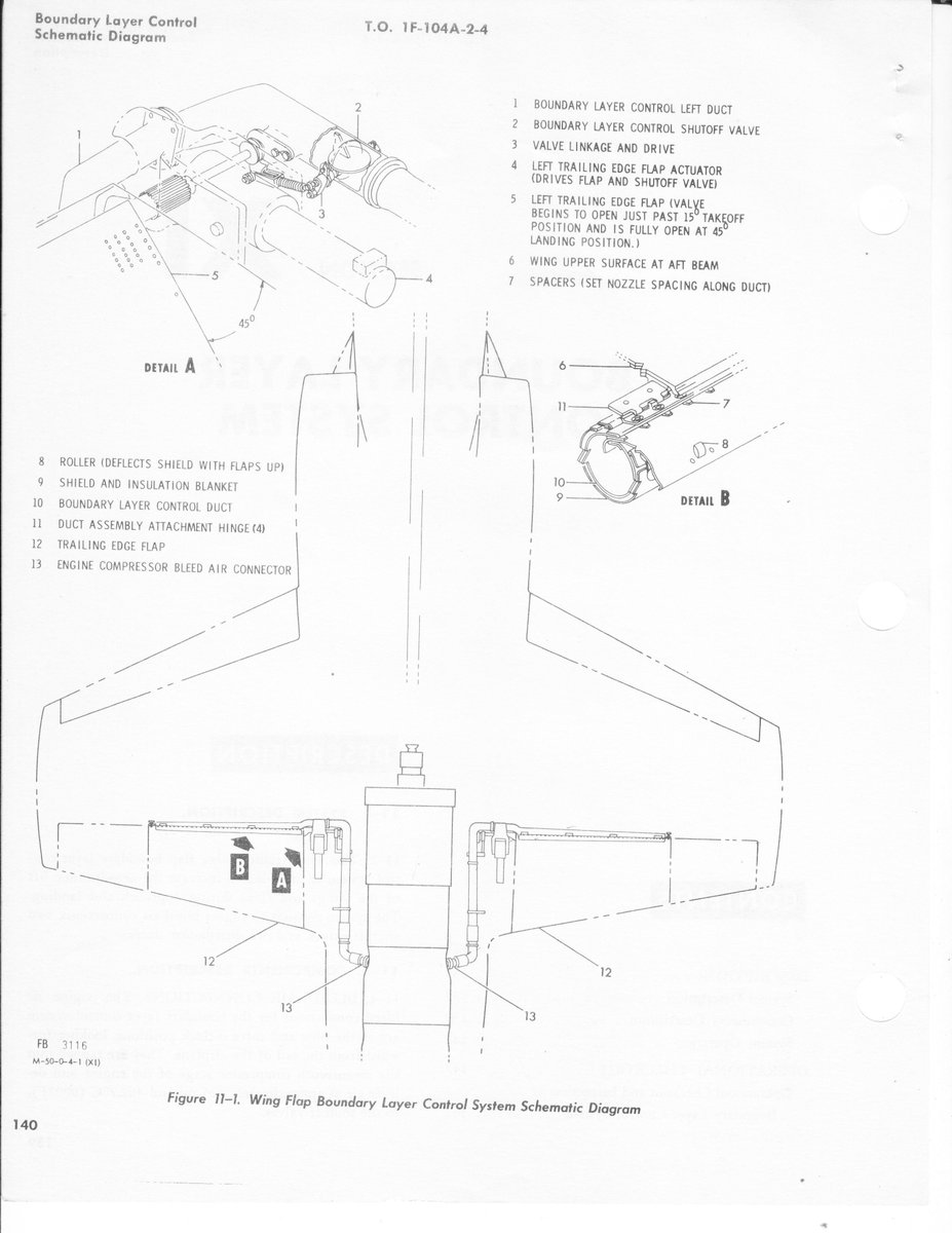 High-pressure air is bled from the engine, fed into a plenum tube running along the wing, and blown through slits ahead of the upper surface of the flaps to energize airflow over them and generate additional lift at low speeds.
