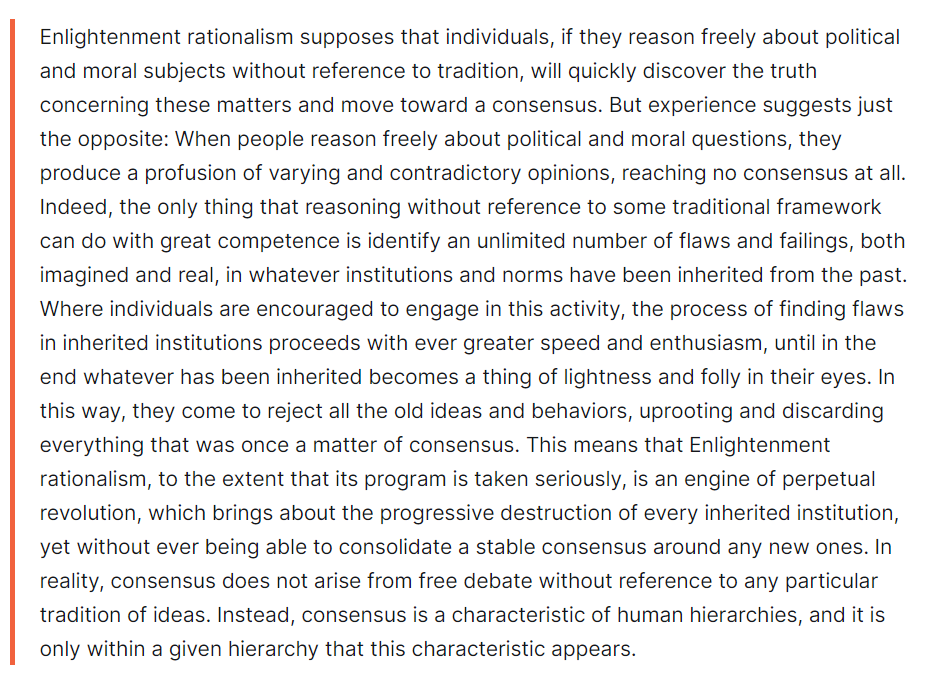 https://twitter.com/RichardHanania/status/1767579903019610148You can see this patten emerge around the time of the Enlightenment when the revolutionary philosophes praised critical reason and the interrogation of authority and conservatives like Burke dismissed the "empire of reason" and De Maistre called it a "destructive" force.