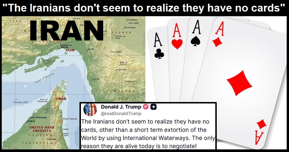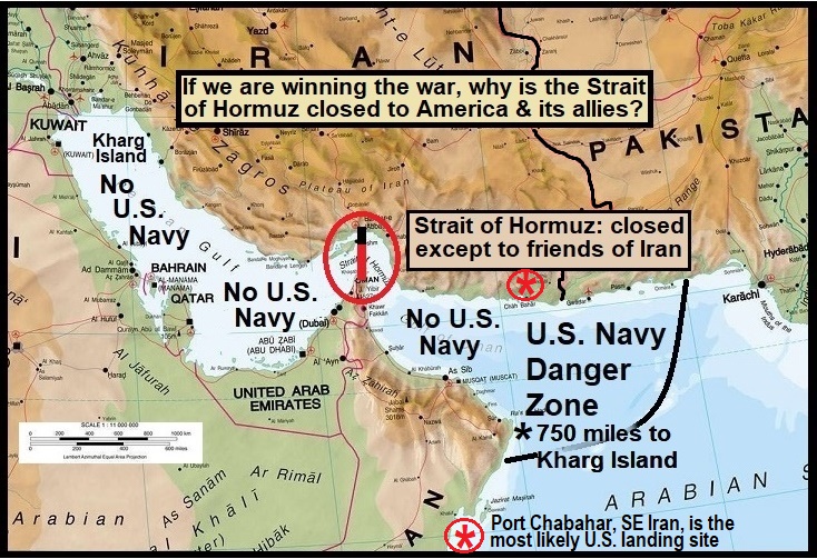 2. Iran will not concede control of its 4 Aces. The Strait of Hormuz will have to be taken by force. For now, the US Navy is staying far, far away. The admirals don't want to repeat Gallipoli.