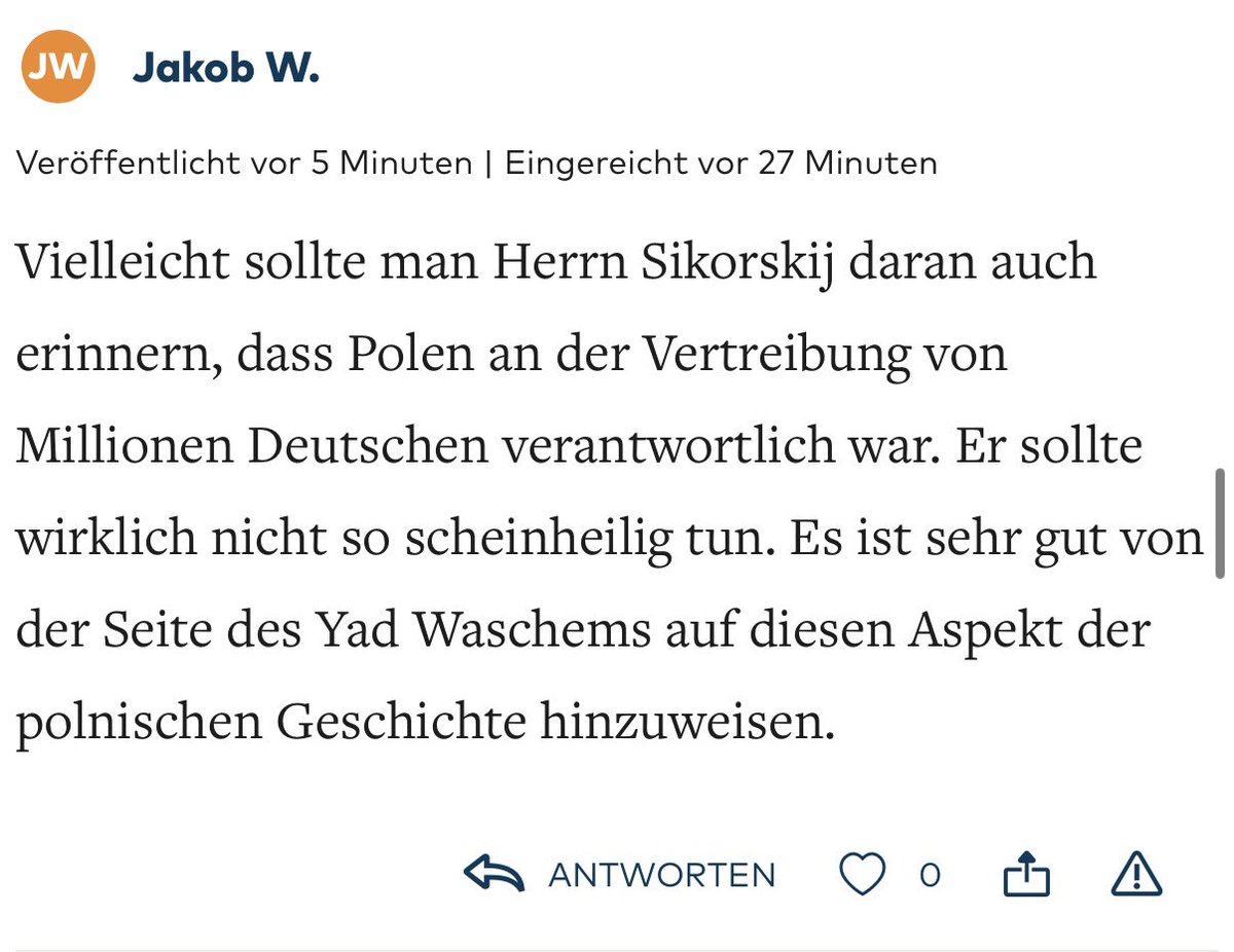 https://twitter.com/adyplomata/status/1993047427306414569💬 “Może należałoby również przypomnieć panu Sikorskiemu, że Polska była odpowiedzialna za wypędzenie milionów Niemców. Naprawdę nie powinien zachowywać się tak obłudnie. Bardzo dobrze, że Yad Vashem zwraca uwagę na ten aspekt polskiej historii.”