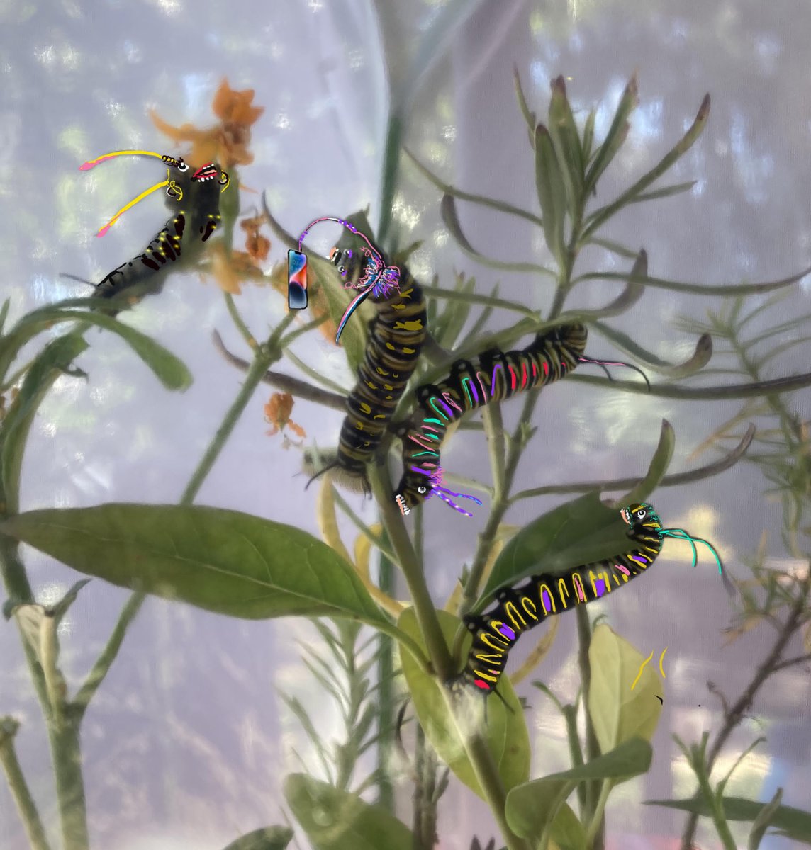 Finally a way to push back against people with pix of grandchildren. Here are my 7 monarch butterfly toddlers. Dont know how I keep them in milk-weed b/c the season is over. Ive been lecturing them to hurry up and move into chrysalis but you know these kids today.