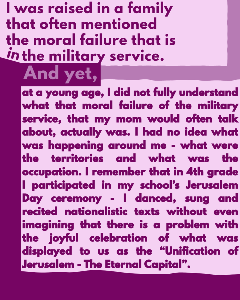 "After much consideration I've come to the conclusion that due to ideological reasons I cannot allow myself to serve in the IDF. It is clear to me now that the values and actions the IDF upholds and perpetrates go against the very basic moral principles by which I live."