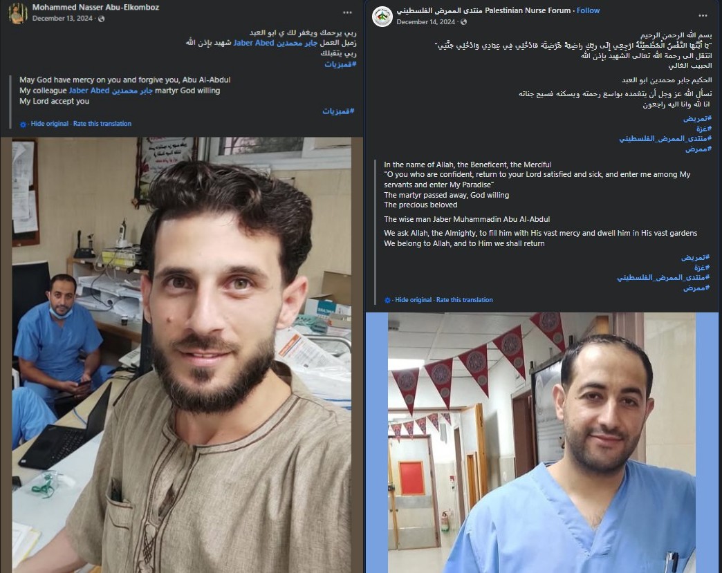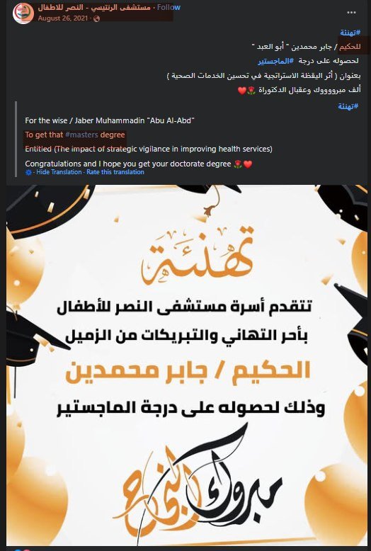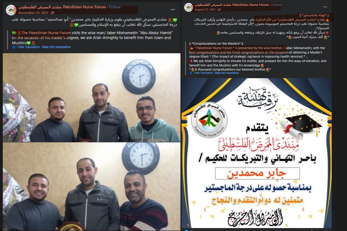 2/ Facebook posts: he appears in nurse uniform, is mentioned by the Palestinian Nurse Forum and Al-Rantisi–Al-Nasr Children’s Hospital, and in 2021 received a Master’s degree in a health-related field.