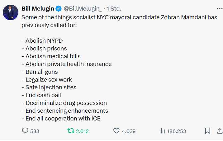 https://twitter.com/EYakoby/status/19371744848484313411b) "Some of the things socialist NYC mayoral candidate Zohran Mamdani has previously called for: