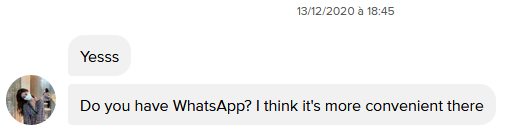 Ok alors tout commence sur Tinder où je match avec quelqu'un qui se dit être en Chine et qui après quelques messages, souhaite passer sur Whatsapp. Pour l'instant rien de particulier quand on ne connaît pas.