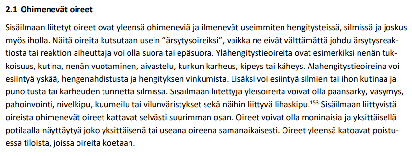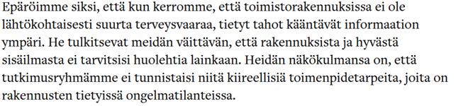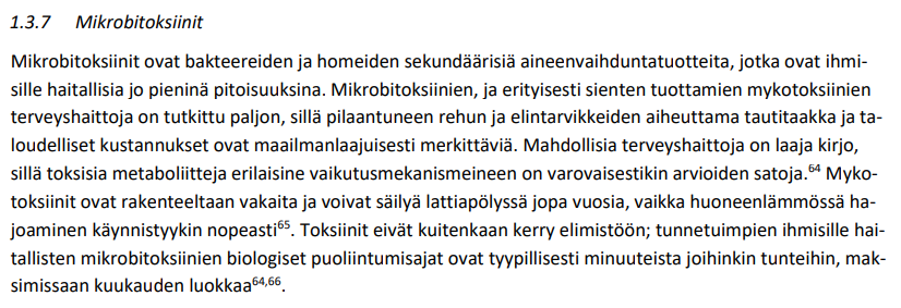 https://x.com/MinnaHaavisto/status/1739961580022812752?s=20Ensinnäkin mikrobitoksiinit käsitellään erillisenä kappaleenaan otsikon Muut sisäilman epäpuhtaudet alla, ei suinkaan kosteus- ja mikrobivauriot kohdassa, johon ne oikeasti kuuluisivat. Koko toksiini-kappale keskittyy luomaan mielikuvaa vaarattomista pitoisuuksista. 2/