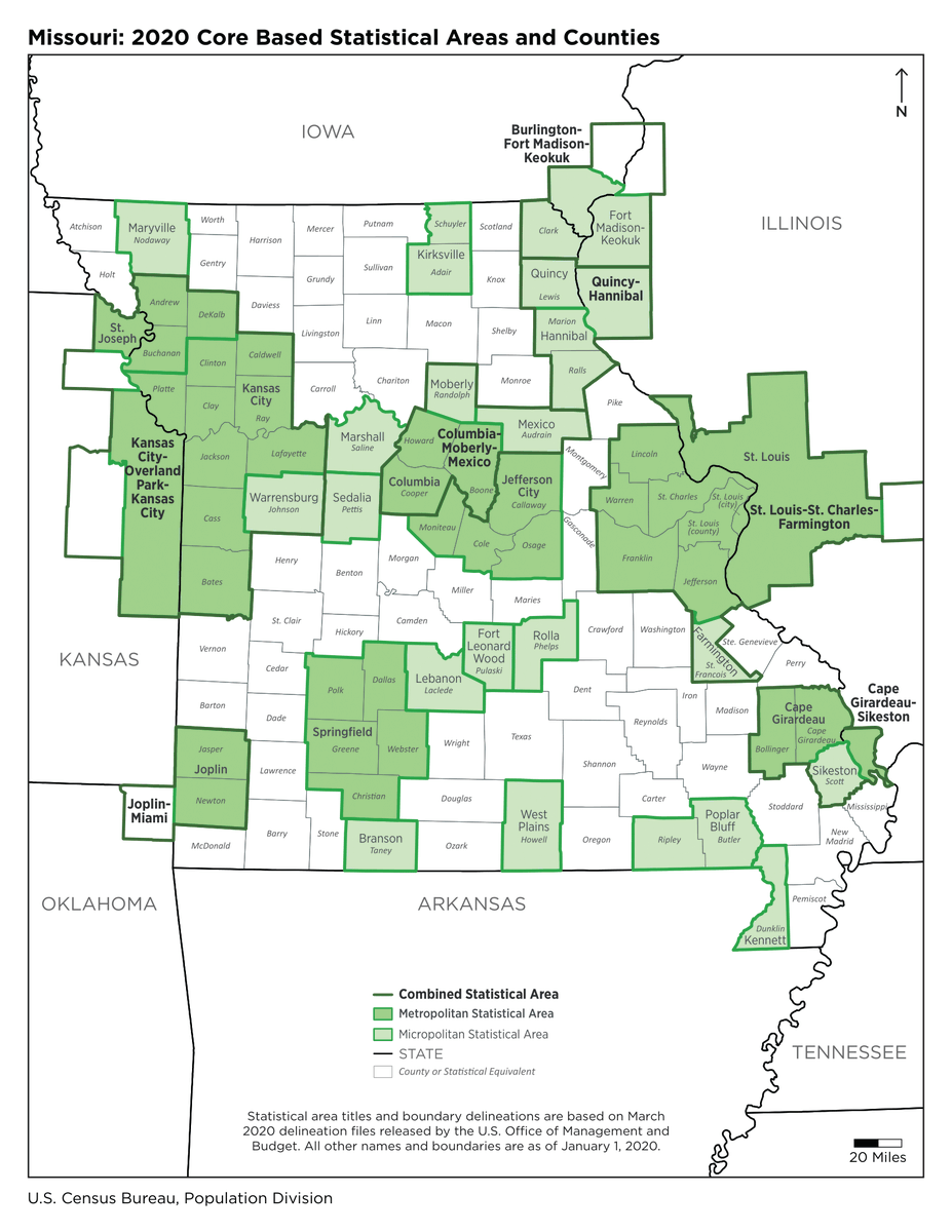 About 55% of Missouri's population lives in its two principal metro areas (~35% in St. Louis and ~20% in Kansas City).