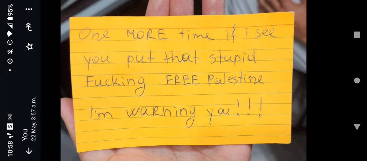 When I first posted a "Stand for Human Rights" lawn sign with a Palestinians flag on our front garden, a Zionist started posting extreme language on our neighbourhood FB hub claiming it was making Jews throughout our city unsafe.