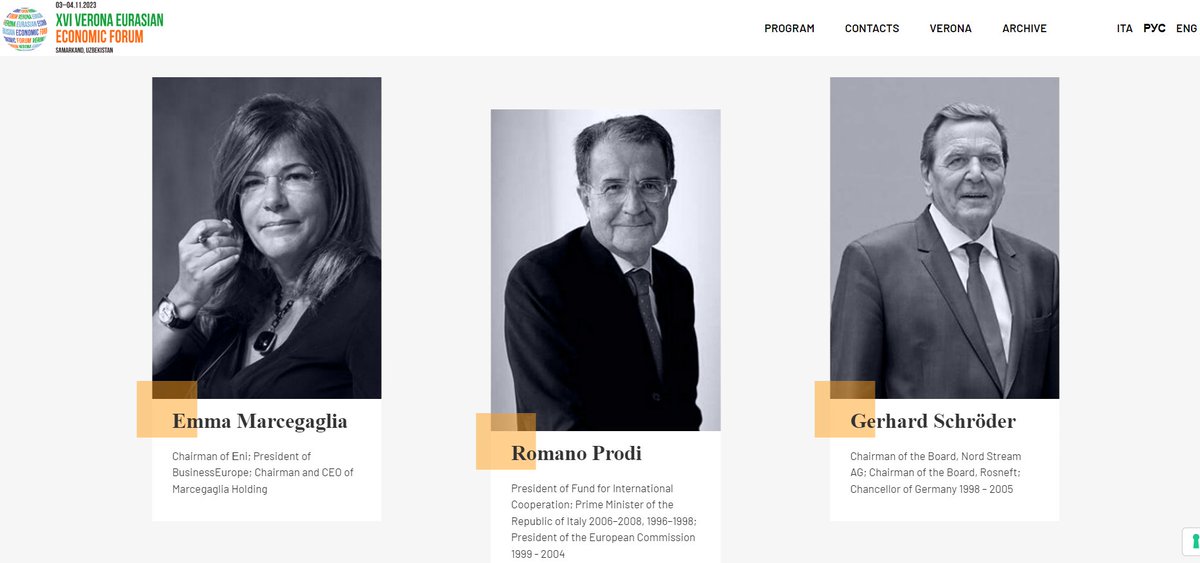 Speakers from previous years featured prominently on the website: Antonio Fallico, Ivan #Glasenberg, Emma #Marcegaglia, Romano #Prodi, Gerhard #Schroeder.