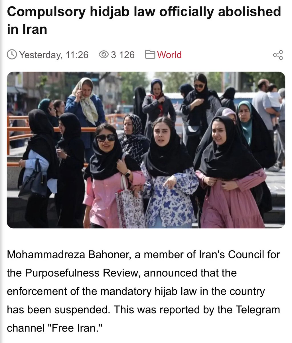 🇮🇷 Iran has abolished the mandatory hijab, according to authorities.