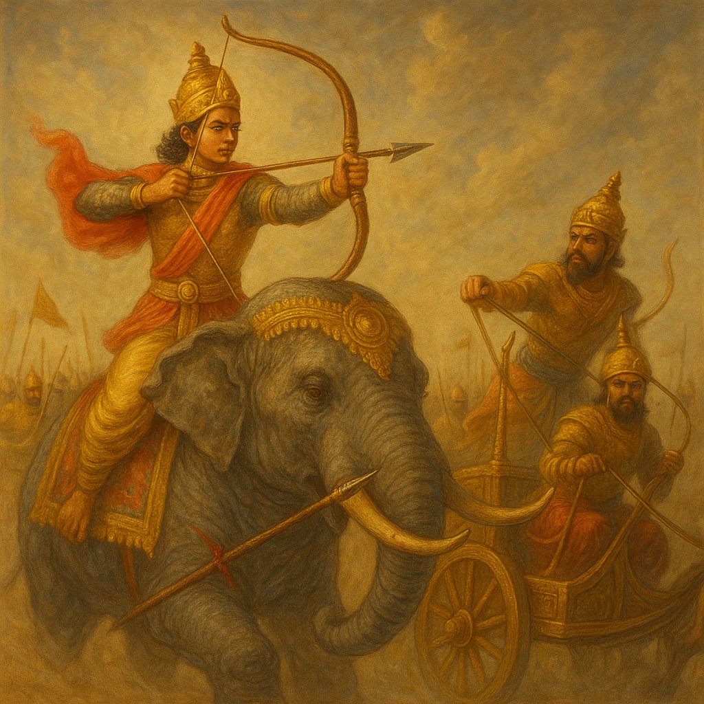 Jayadratha, King of Sindhu, was considered equal to two Rathas. He harboured deep resentment against the Pandavas for humiliating him during Draupadi’s abduction. Having performed intense austerities, he had received a boon to challenge them and was determined to fight to the death.