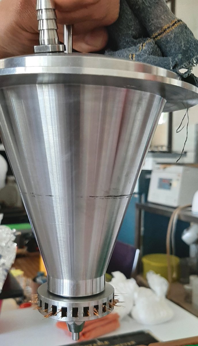 Los líquidos se hacen pasar por un aspersor de muy alta velocidad que atomiza la solución en una cámara de secado donde circula aire caliente.