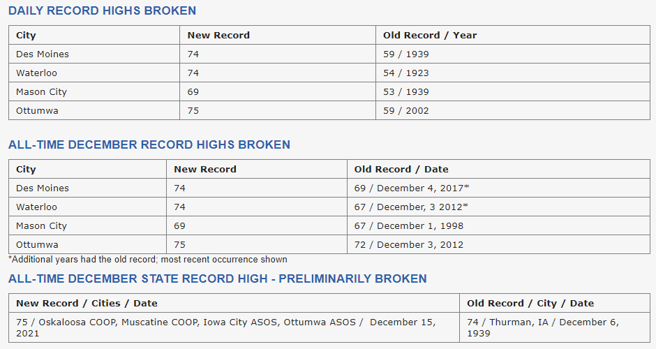 🌡️Many who were in Iowa will remember unusually warm temperatures before the storms started on Dec. 15th 2021. This day shattered multiple daily high records by nearly 20° F and surpassed the all-time state record for December with a high of 75°F in Oskaloosa! (2/?)