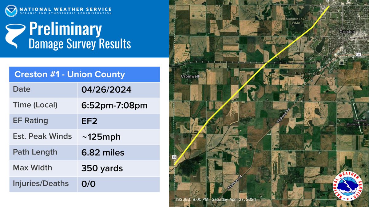 (1/9)Here are the preliminary storm survey results for the tornadoes that impacted portions of central Iowa on April 26th. Additional surveys will be forthcoming and more paths may be discovered. #iawx
