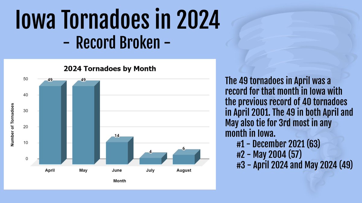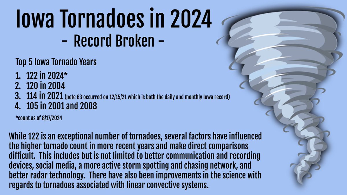A preliminary count of Iowa tornadoes in 2024 shows 122 (so far), breaking the previous record of 120 in 2004.