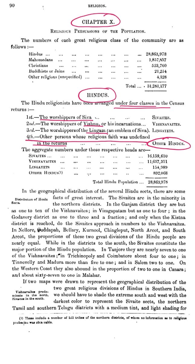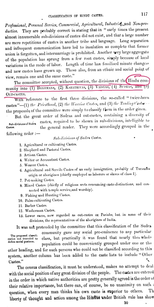 1871 census...hindu community are 1. Brahmans, 2. Khastriyas 3. Vaisya 4. Sudras 5.outcasts 2. Hindus are those who worship siva, vishnu, lingayats. For others whom they couldn't find reason for inclusion classified as OTHER HINDU CASTES