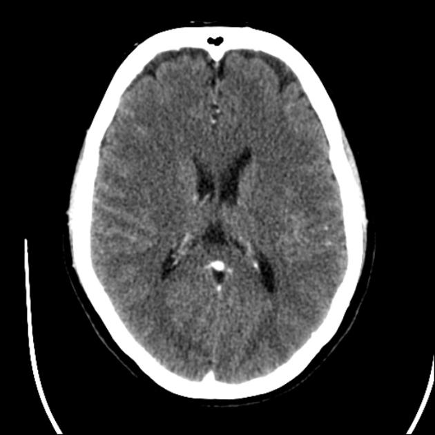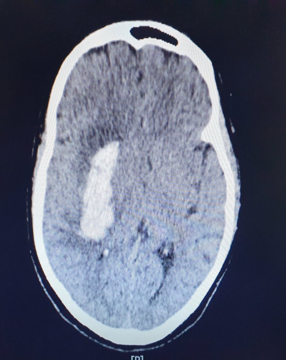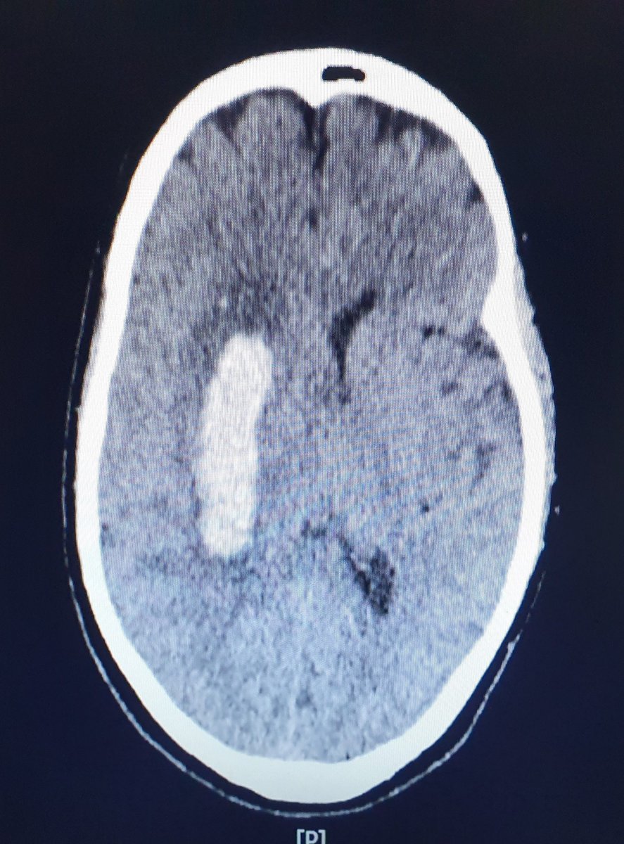 CT Brain tu tunjuk yang dah berlaku pendarahan dalam otak sebab tekanan darah yang terlalu tinggi.
