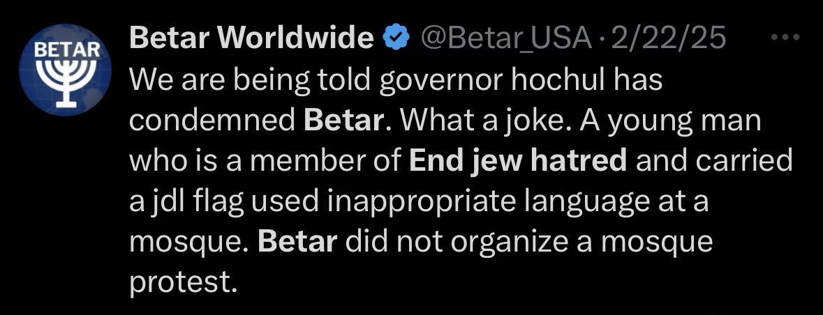 https://twitter.com/GoldsteinBrooke/status/1910248744232112154Goldstein created End Jew Hatred. They claim to combat antisemitism but are linked to individuals known for Islamophobic hate speech, like Justin Dobbins, who was recently condemned by Mayor Adams and Governor Hochul for his racist tirade outside a Brooklyn mosque.