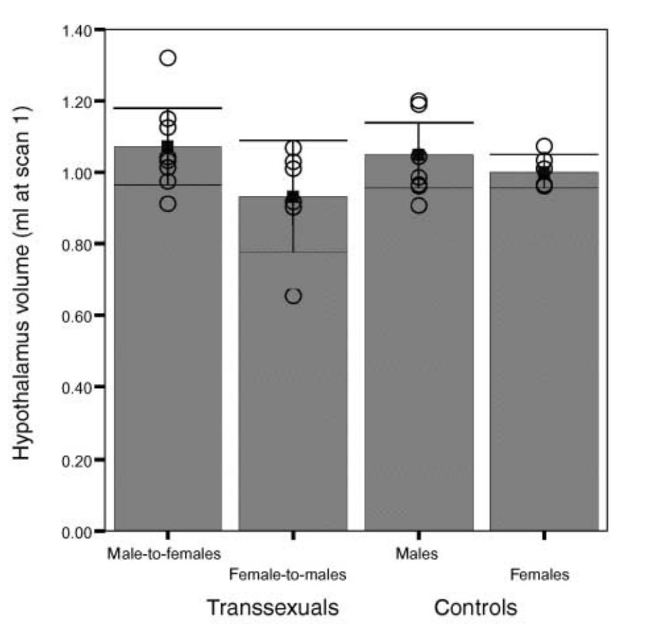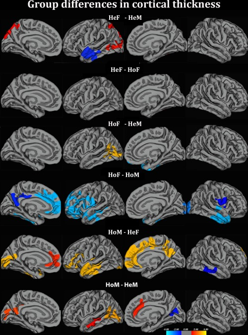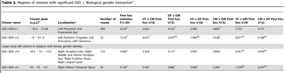 In their whole-brain comparison on CTh in relation to sexual dimorphism, the authors found that FtMs did not differ from female controls (thus having a CTh pattern congruent with their biological sex). Similarly, MtFs also did not differ to female controls (thus having a CTh pattern reflective of the opposite sex).