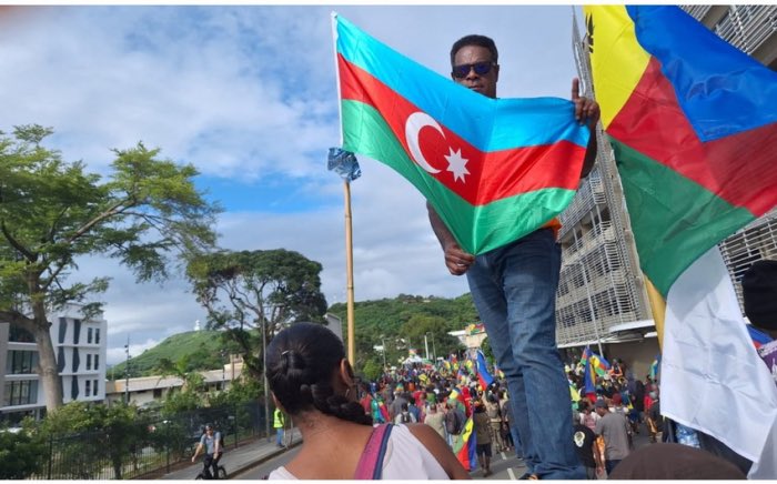 📌Ces derniers jours, l’Azerbaïdjan est apparu à plusieurs reprises suite aux émeutes en cours, que ce soit sur les réseaux sociaux ou directement sur place, avec ici le drapeau du pays arboré par des indépendantistes.
