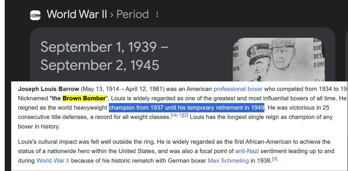 Joe Louis with his nickname "Brown Bomber" is interesting given his reign was throughout the entirety of WW2.