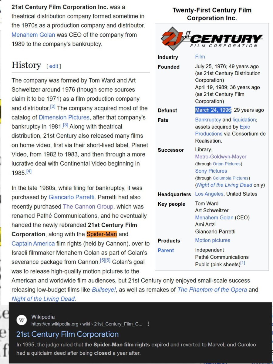 03/24/1996 Twenty-First Century Film Defunct - Held Spider-Man Rights