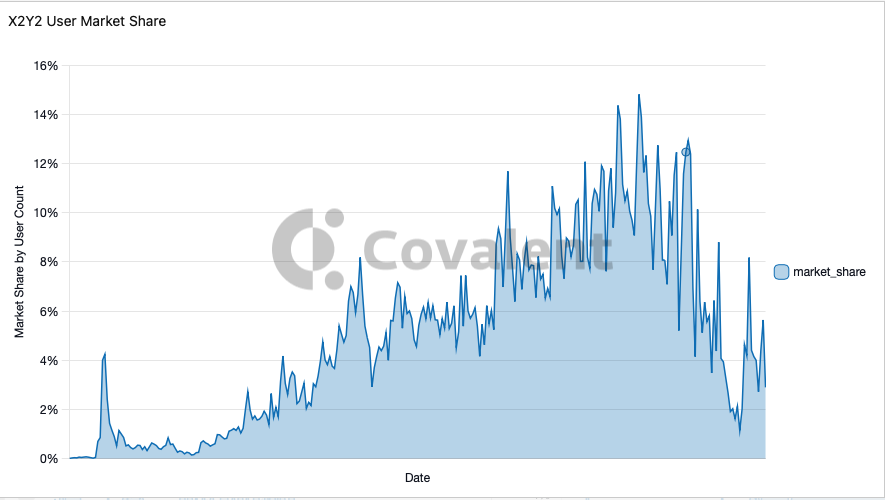 From launch in Jan 2022, we can see that x2y2's user base market share was steadily increasing and reached it's peak around 14% of the entire NFT market on ETH chain, but has collapsed in recent months to around 3%, not a good sign