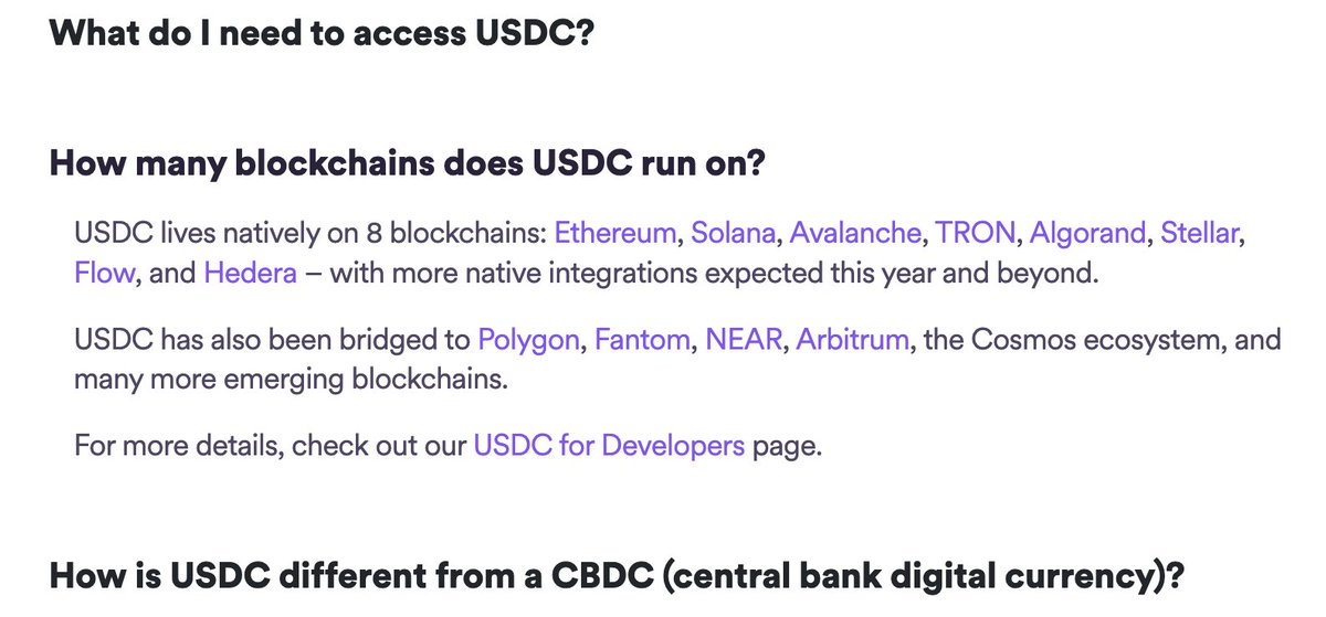 USDC:进入官网首页后,下滑至 FAQ,便有一条说明USDC 在 8 条链上是原生的,Ethereum/Solana/Avalanche/TRON/Algorand/Stellar/Flow/Hedera,其他链上均为桥接资产 (2/n)