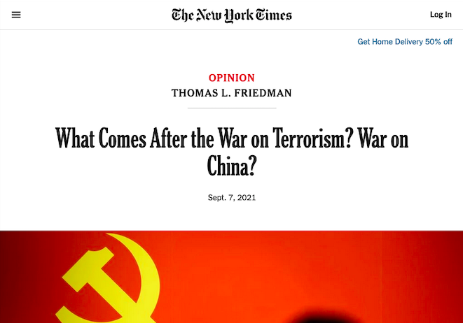 In his column in the New York Times for Sept. 8, noted author @tomfriedman begins with the provocative headline, “What Comes After the War on Terrorism? War on China?”