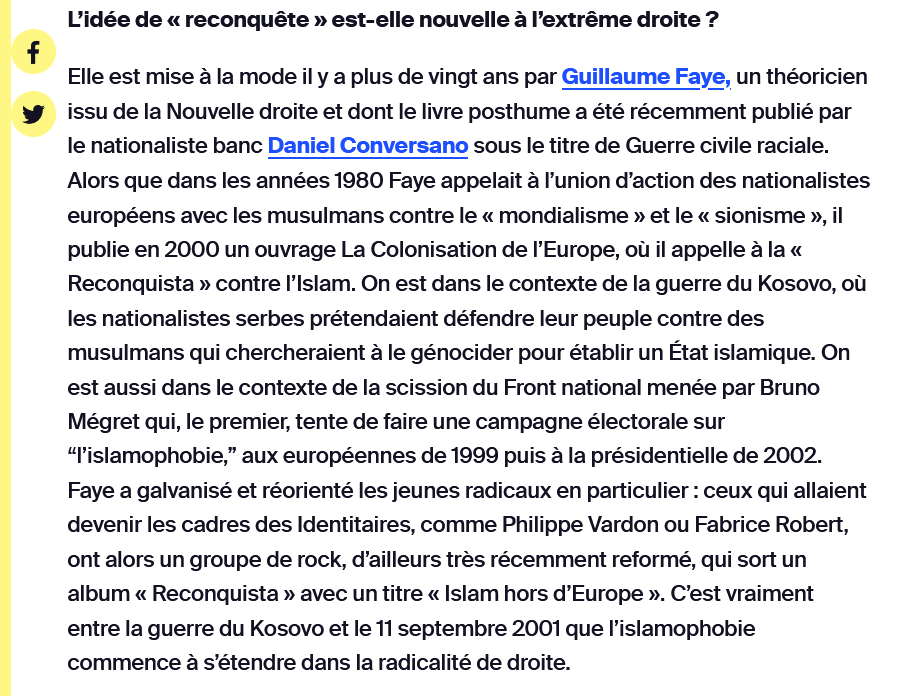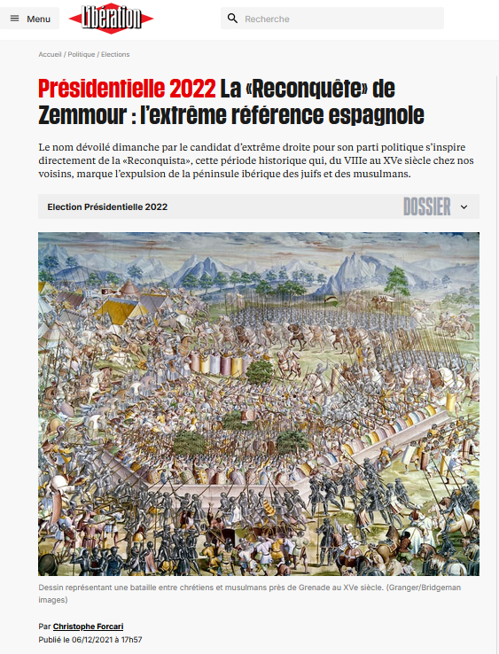 https://twitter.com/Collectif_Golem/status/2031148353564614893Le nom lui-même. « Reconquête » renvoie à la Reconquista espagnole — expulsion des juifs, Inquisition, conversions forcées. Le chercheur Nicolas Lebourg rappelle que les fondateurs du Bloc identitaire avaient un groupe de rock nommé Reconquista, auteur de « Islam hors d'Europe »