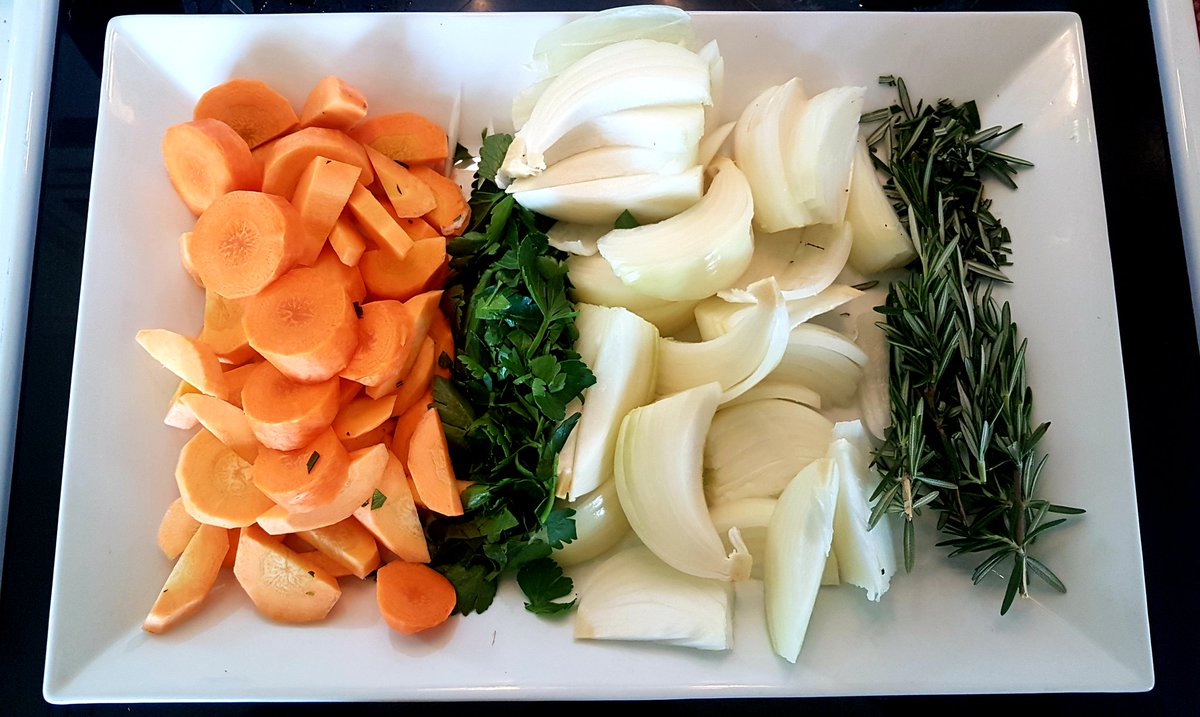 While your fire is settling in, rough-cut a hearty pile of carrots, celery, onions, & rosemary. (I start with the rosemary so the fragance is infused throughout the board, knife, subsequent vegetables, & home.)