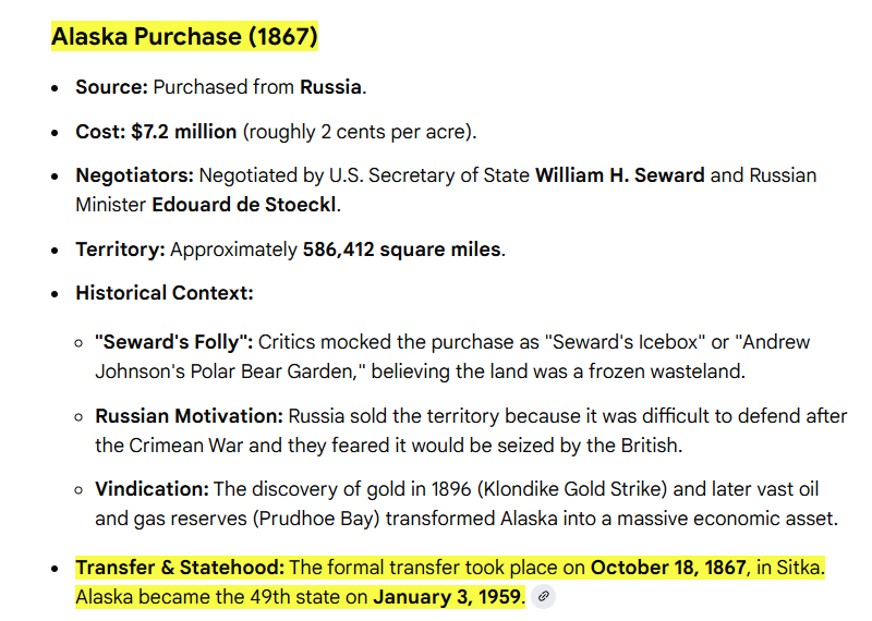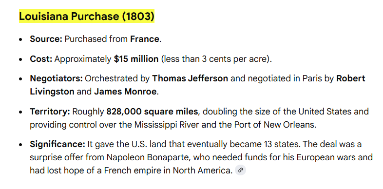 The United States significantly expanded its territory through two major historical acquisitions: the Louisiana Purchase (1803) and the Alaska Purchase (1867).