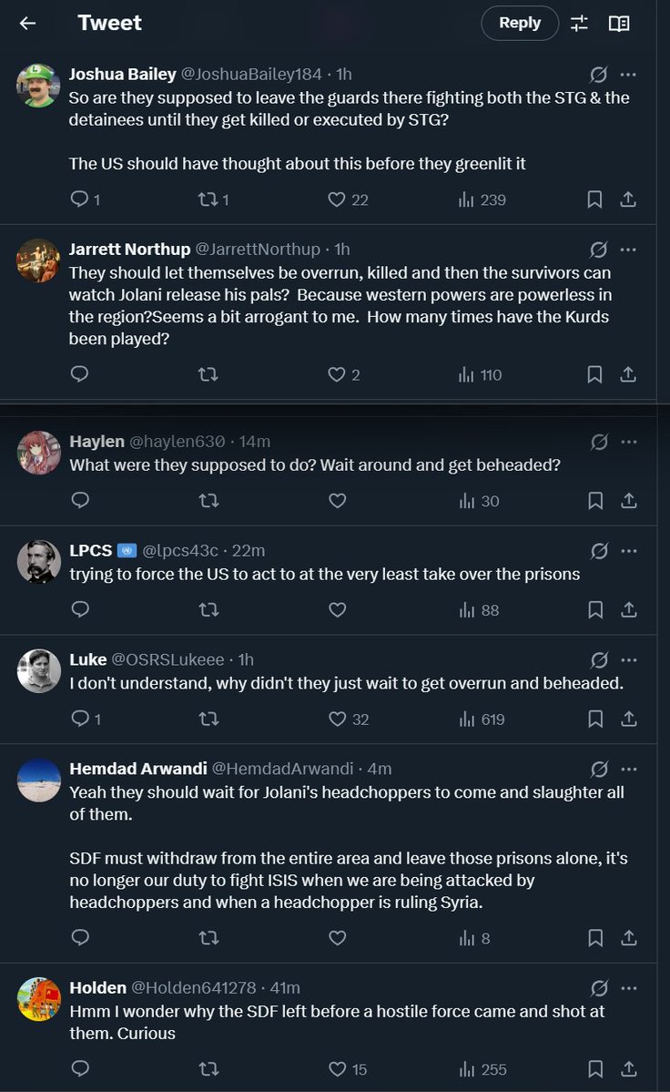 https://twitter.com/farhad_shami/status/2013600052548182275This isnt to undercut the failure of policy, especially in Western capitals, that allowed al-Hawl to sit there while the SDF was trying to establish procedures and mechanisms. But withdrawing more-or-less out of spite that the US isn't providing you with armed support ain't it.