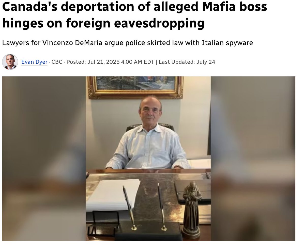 Canada is trying to deport Jimmy DeMaria, allegedly a senior figure in the "Siderno Group,” which authorities say is a Toronto-based branch of Italy’s ’Ndrangheta mafia. As @CBC reports, the case hinges on foreign wiretaps — raising questions about foreign interference and constitutional rights in Canada: cbc.ca/news/politics/…