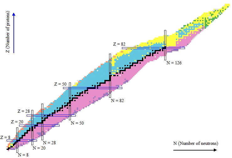 The colour illustrates the half life of each type of atom, the vast majority of atomic structures decay quickly but the chart shows a spine of stable atoms in assembly-space.