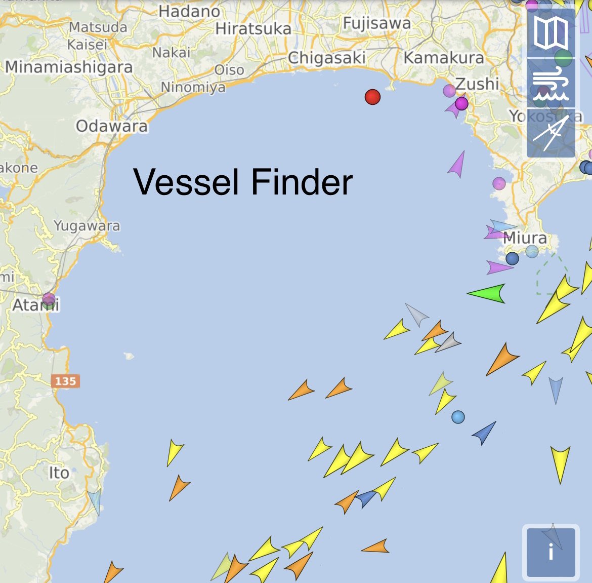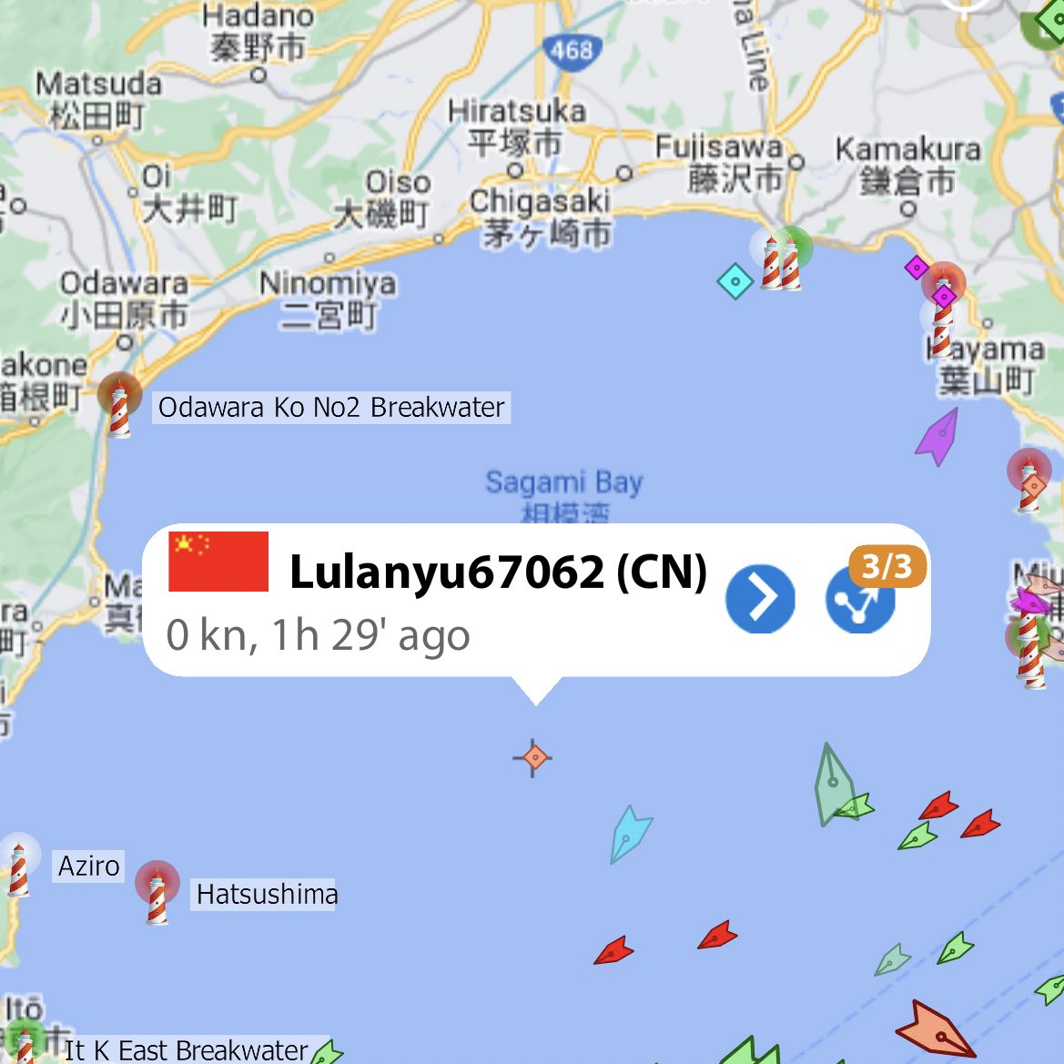 当該船が相模湾周辺海域にてAIS上で表示されているのは確認したところ、Marin Trafficのみです。