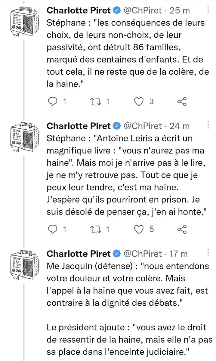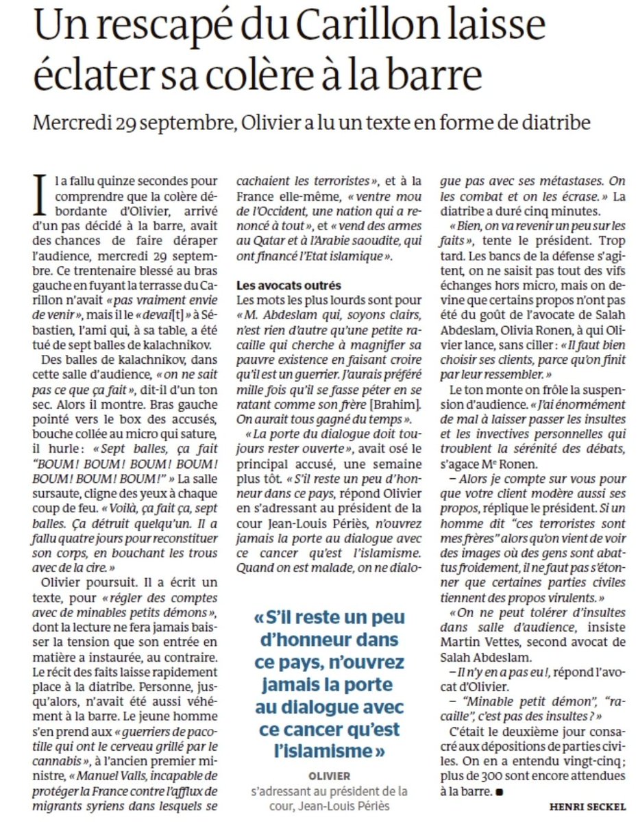 Thread : Voilà 4 mois que j'ai déposé devant la Cour d'assise du #13novembre...4 mois où j'ai naïvement pensé que ce procès serait l'occasion d'un grand débat de fond entre les français...4 mois où je regrette d'avoir été silencieux. Ce que vous avez pu lire @lemondefr : 1/ Ce que j'ai dit (en vrai) :