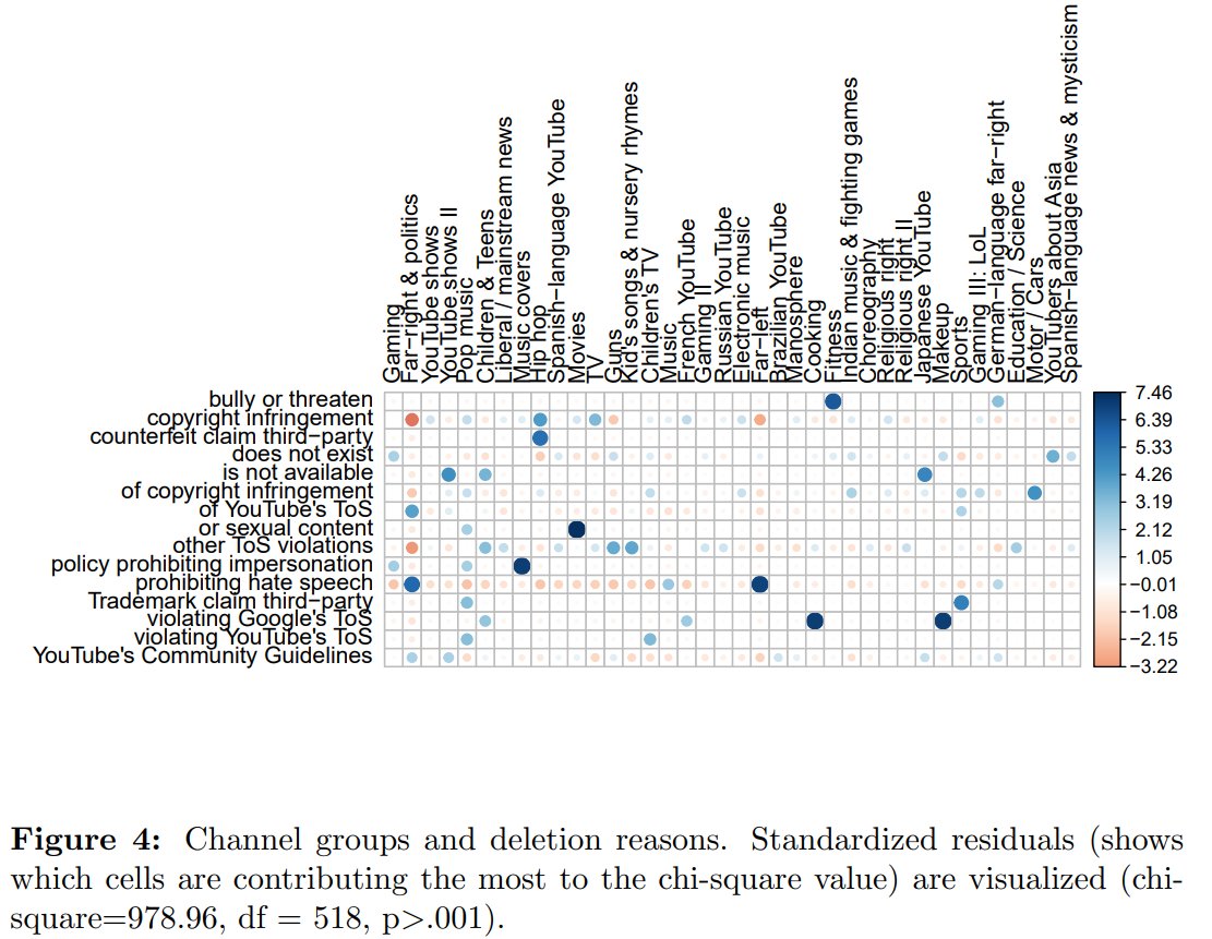 Analysis of 11k channels shows that removal of channels (5.6%) is common on YouTube - reasons are not arbitrary but follow an intuitive logic -> far-right = prohibiting hate speech/ hip hop = counterfeit claims/ movies = sexual content