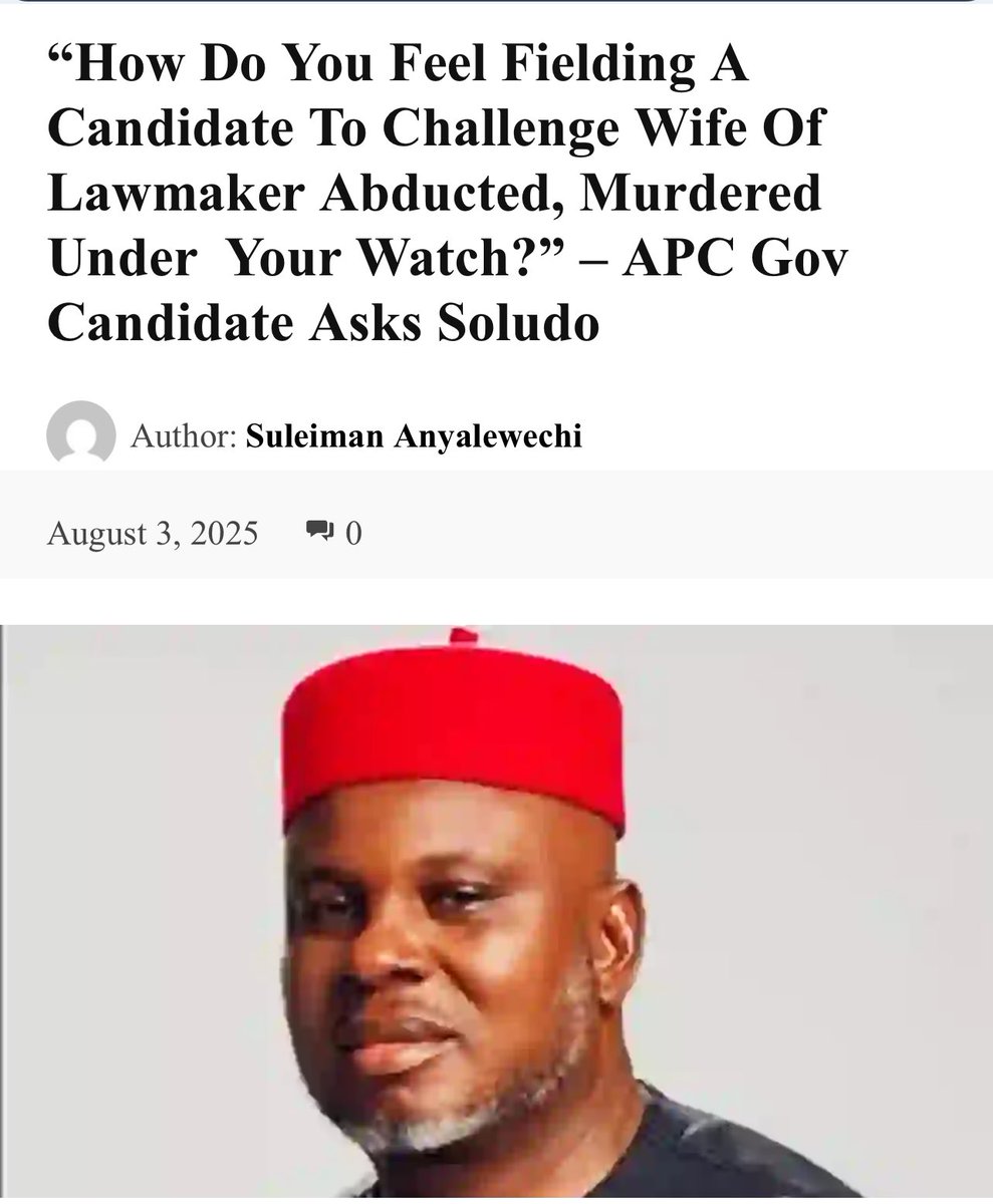 a rival candidate against Mrs. Azuka(who’s trying to claim back her late husband position) in the by-election, drawing ire from the All Progressives Congress (APC), which questioned Soludo: "How do you feel fielding a candidate to challenge the wife of a lawmaker abducted and murdered under your watch?""