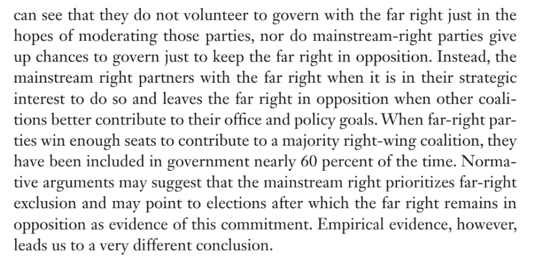 2) "Precisa para chegar ao poder" significa que esses partidos cresceram ao ponto em que a direita tradicional precisa deles. Na maior parte dos casos históricos, as promessas de exclusão iniciais caíram quando a realidade do crescimento eleitoral da direita radical se impôs.