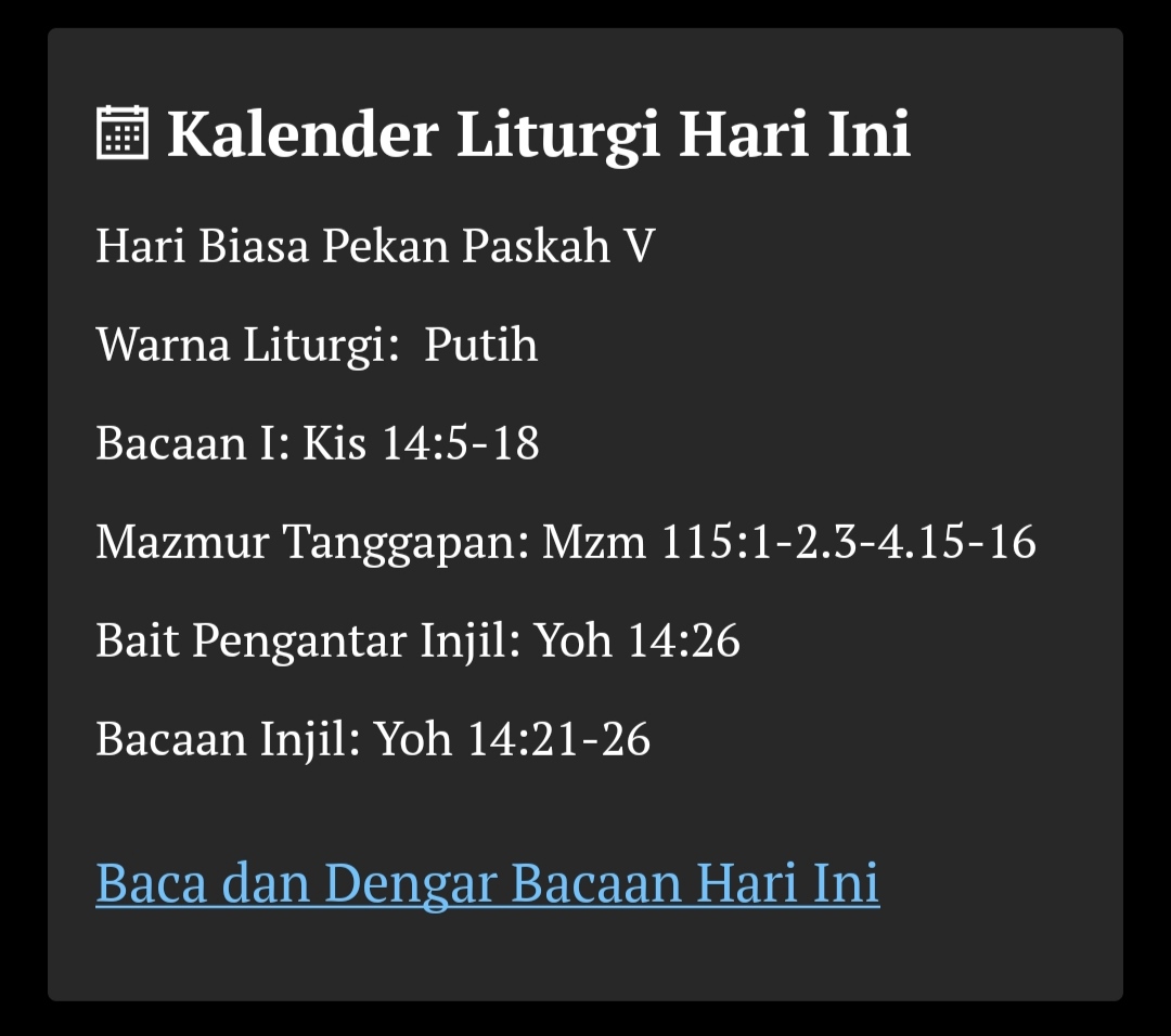 Inilah perintah-Ku, yaitu supaya kamu saling mengasihi, seperti Aku telah mengasihi kamu. Tidak ada kasih yang lebih besar dari pada kasih seorang yang memberikan nyawanya untuk sahabat-sahabatnya.