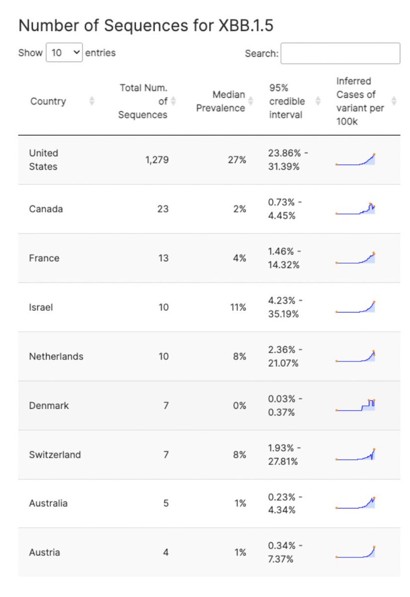Our model currently shows the XBB.1.5 variant is spreading quickly in the United States. Although we should be paying close attention, it may be too soon to sound the alarm. 🧵: 2/ 93% of XBB.1.5 sequences have come from the United States. And inside the US, the majority (76%) of its sequences are from New York. Globally, we have not yet observed a rise in XBB.1.5. Information on the variant’s spread outside the US is limited.