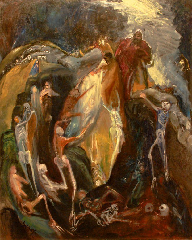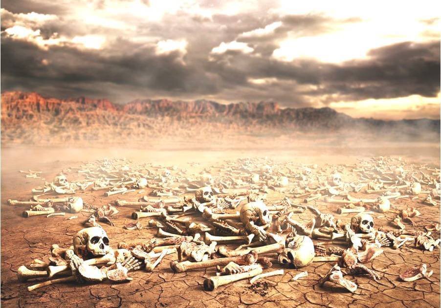 Verses 1-10 set the scene. Ezekiel is standing in a valley covered with dry bones. The Lord commands him to prophesy to the bones, and before his eyes they are physically and then spiritually restored before his eyes.