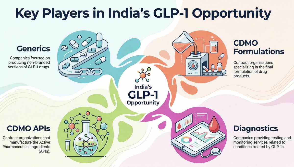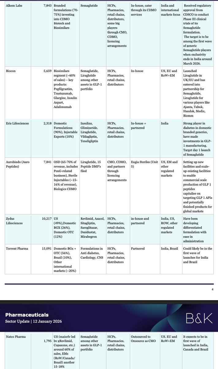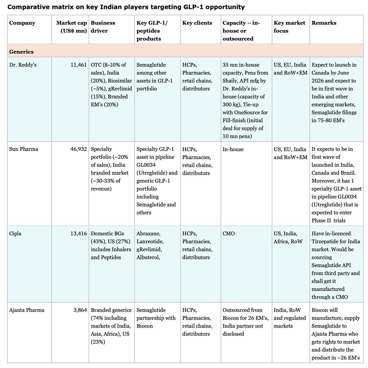 • Sun Pharma: Specialty + generic GLP-1 portfolio; pipeline asset (Utrelutide) adds optionality