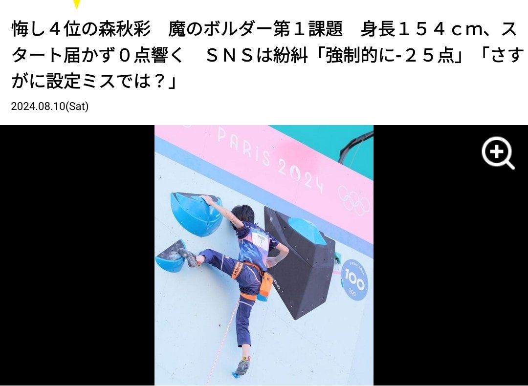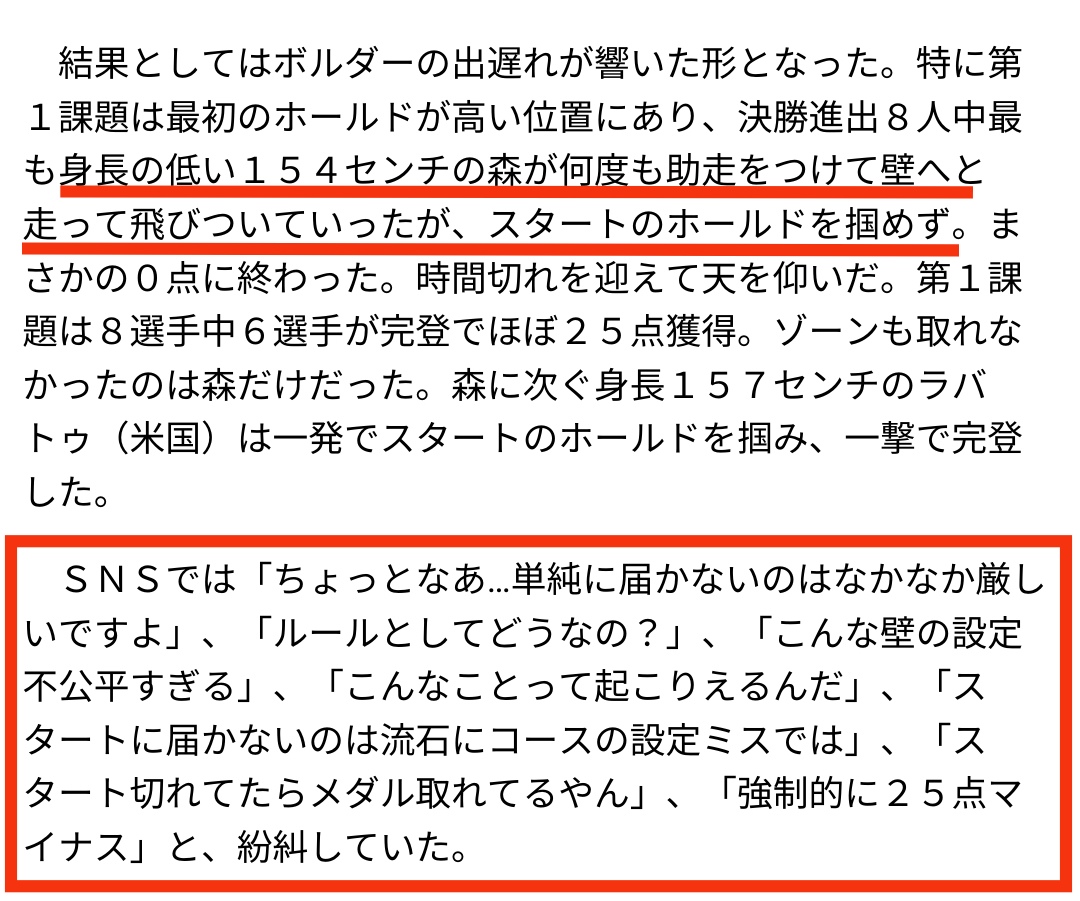 リード種目が世界最高得点だった森選手、このボルダーの低身長排除ステージがなければメダル取れてたとネットざわつく